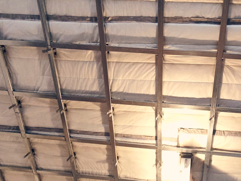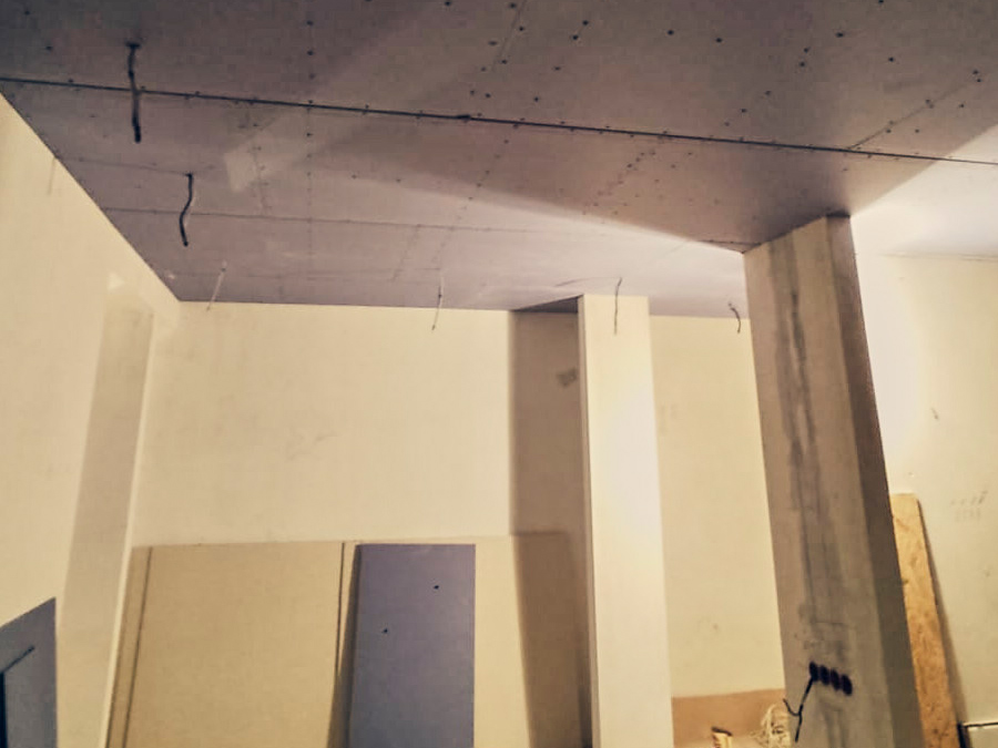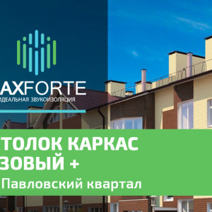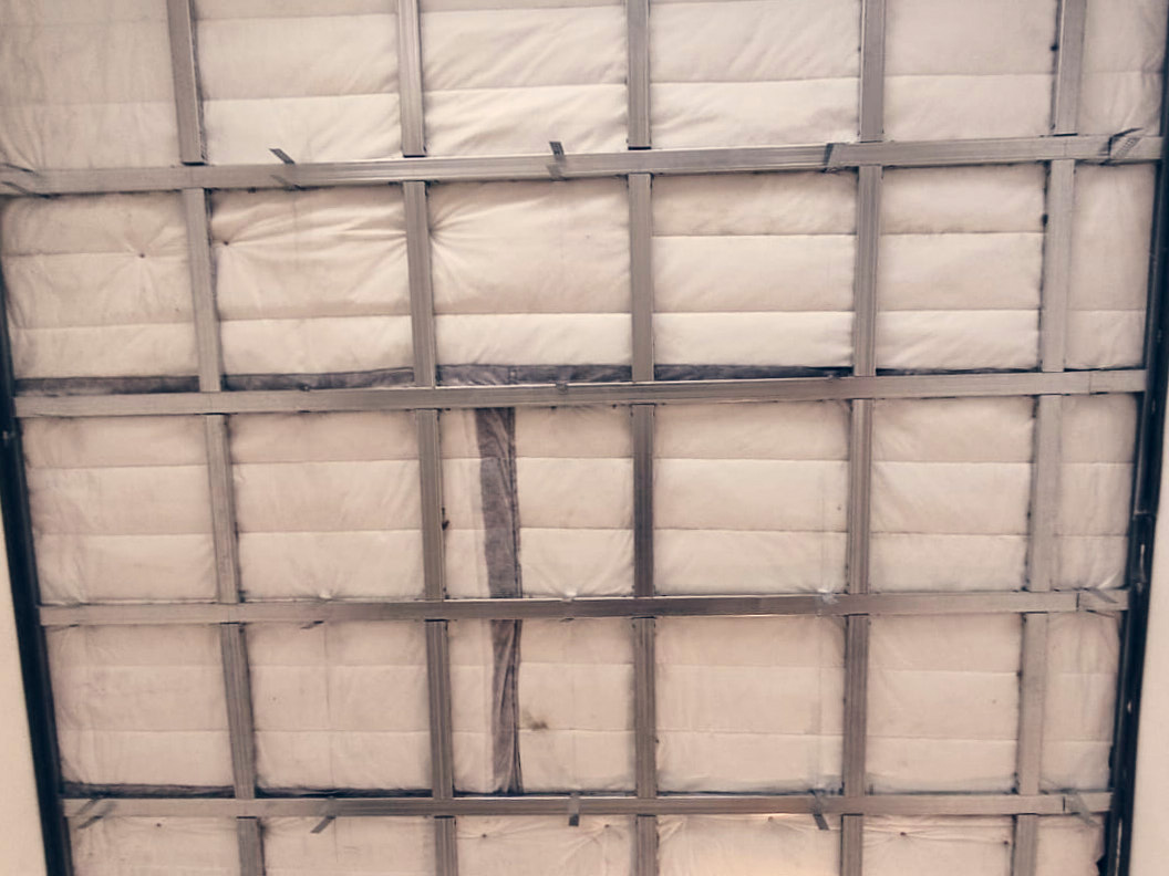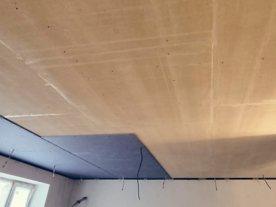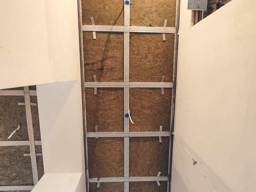 Звукоизоляция потолка комплектом: "каркас базовый +" в таунхаусе. Шумоизоляция выполнена с использованием профилей KNAUF. Для звукопоглощения внутри каждого каркаса уложен комплект МаксФорте ИзолМат и МаксФорте ЭКОплита.