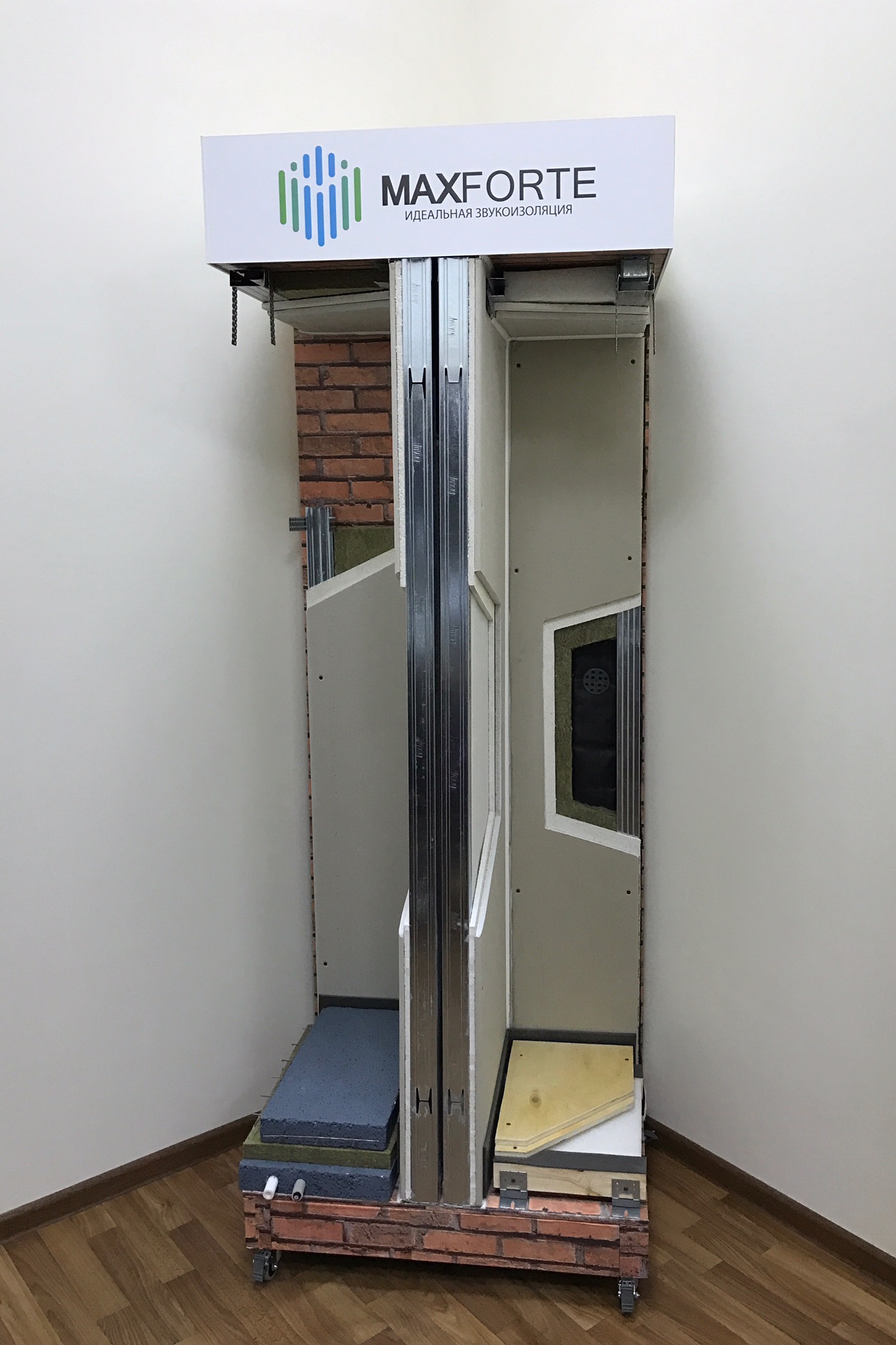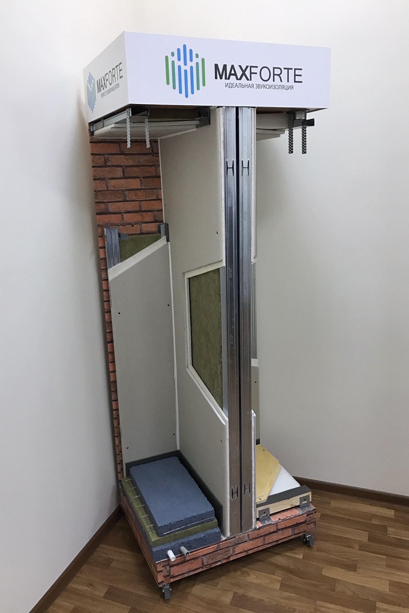 Представляем новый стенд компании МаксФорте. Стенд представляет собой набор основных схем по звукоизоляции потолка, стен и пола. Теперь клиенты нашей компании могут наглядно увидеть звукоизоляцию в сборе и выбрать конструкцию, оптимальную по толщине!