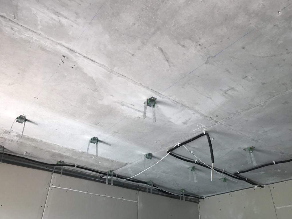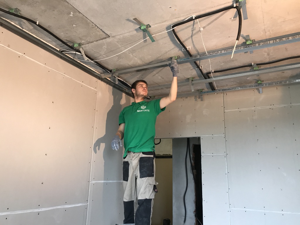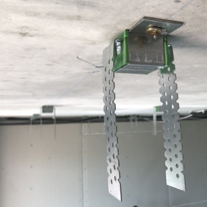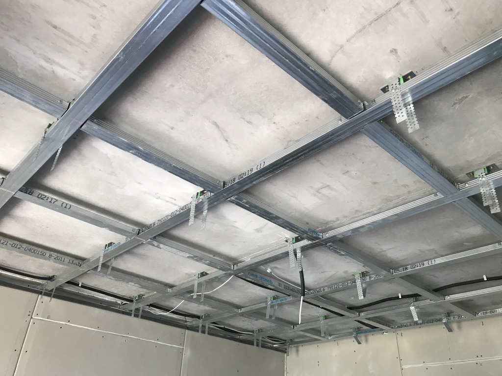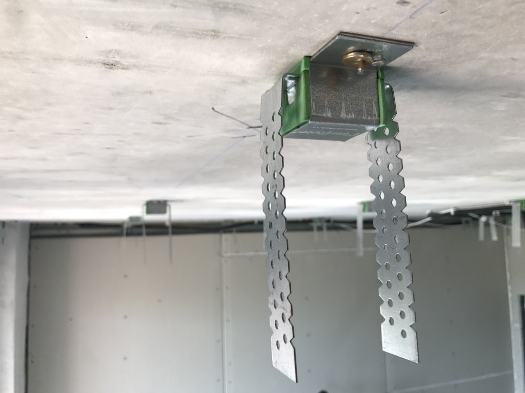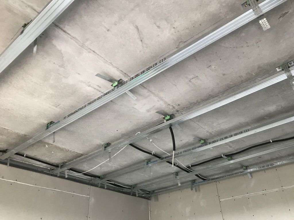Шумоизоляция потолка в новостройке. Для снижения ударного шума используются виброподвесы МаксФорте-ВиброСтоп PRO 25 мм. Воздушный шум снижает ЭКОплита 60 кг/м3.