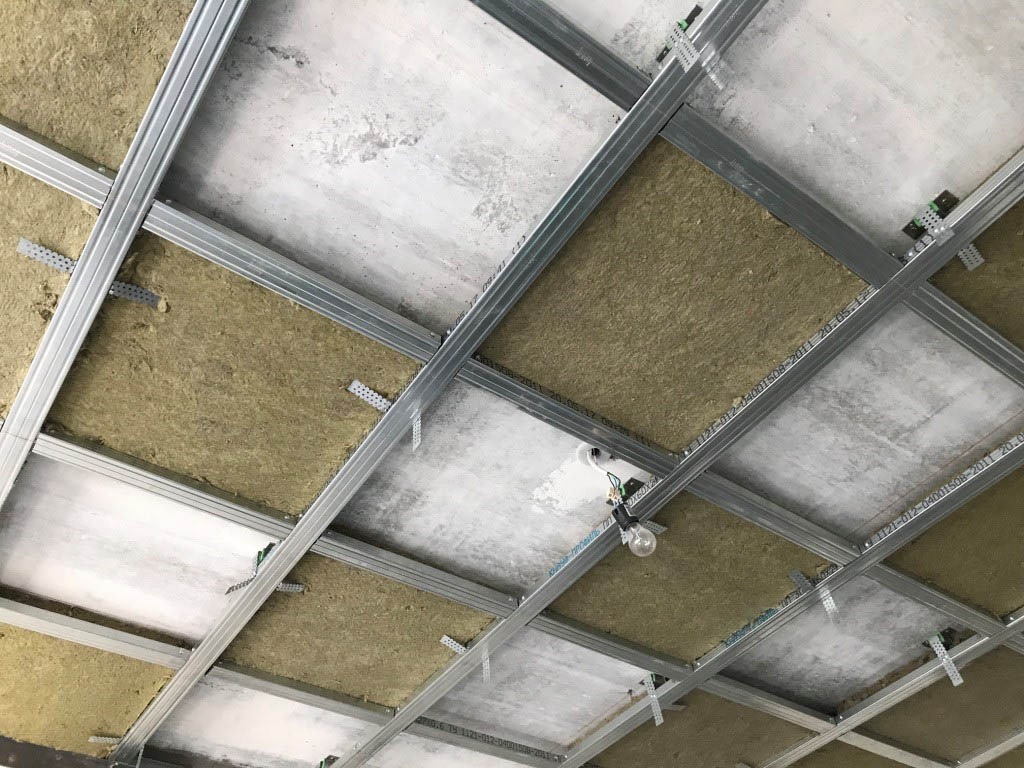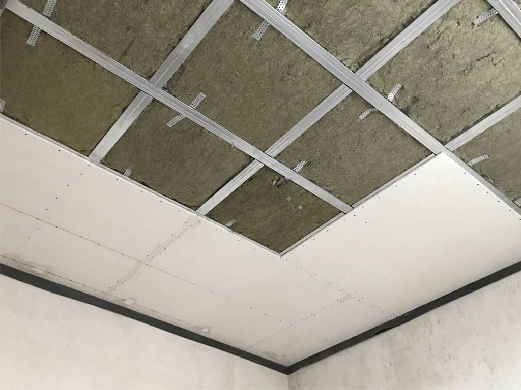 Плитами звукопоглощающего материала МаксФорте-ЭКОплита SLIM плотно заполнить пространство между профилями металлокаркаса.