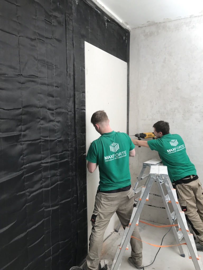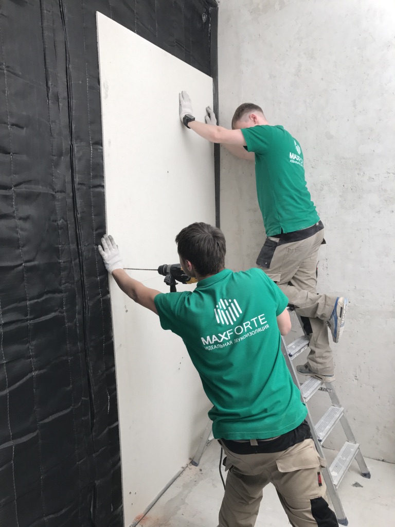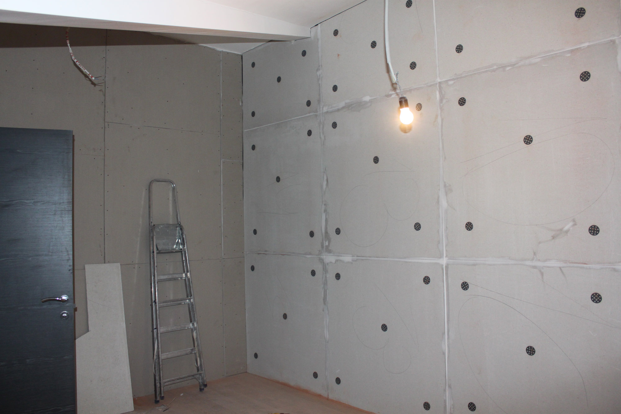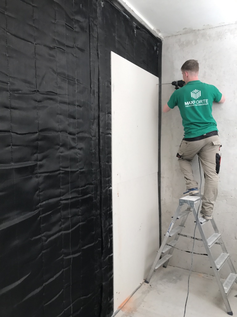 Самый тонкий вариант звукоизоляции стены - бескаркасная схема с использованием