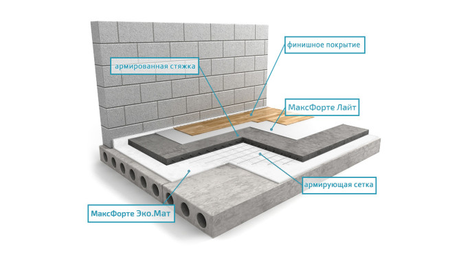 Полная звукоизоляция пола по принципу «плавающая стяжка» с использованием схемы «Плавающая стяжка Усиленная с ЭКО.МАТ» - успешно справляется с ударными и воздушными шумами. (при заказе «под ключ» в стоимость входит и сама «стяжка»)