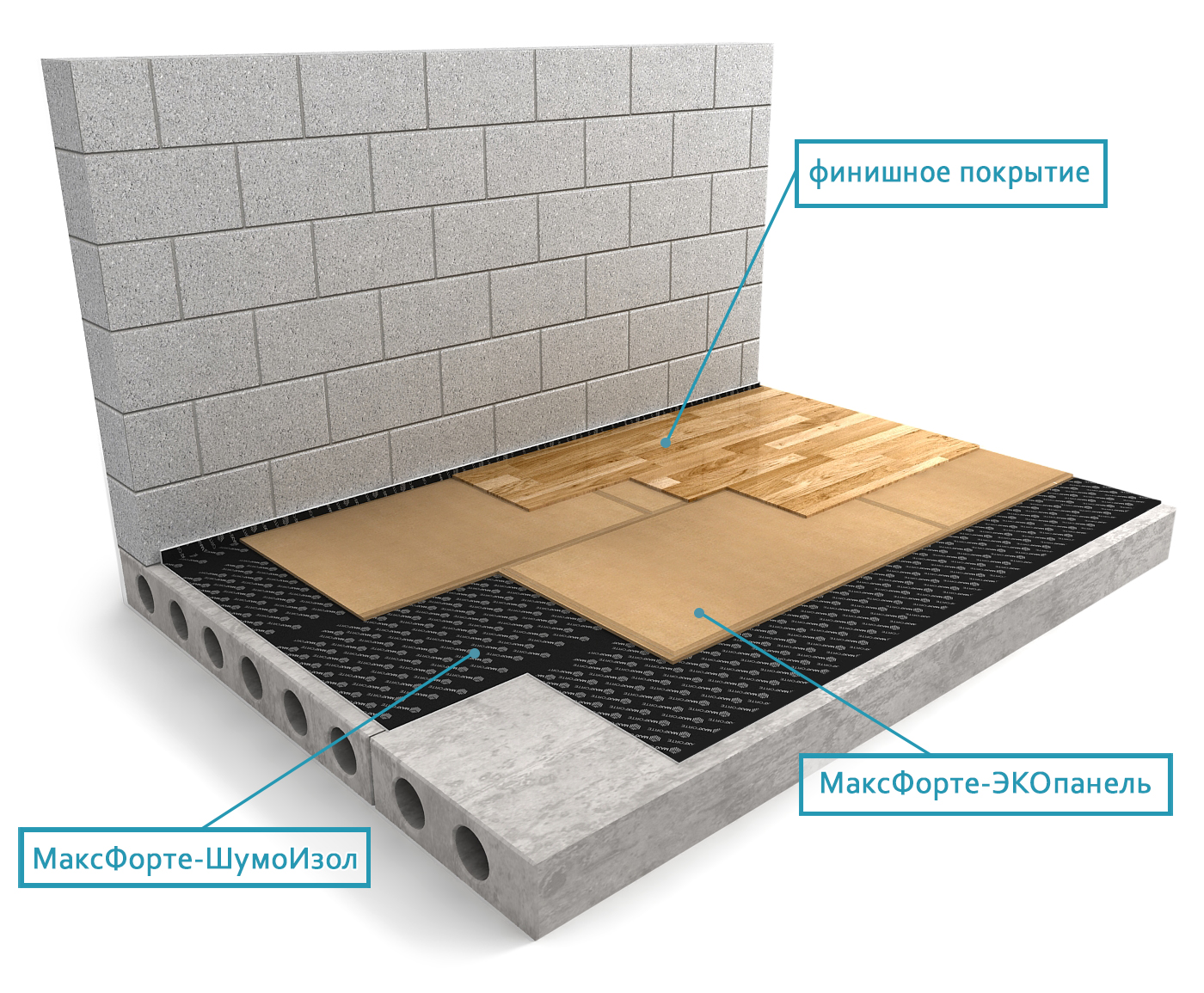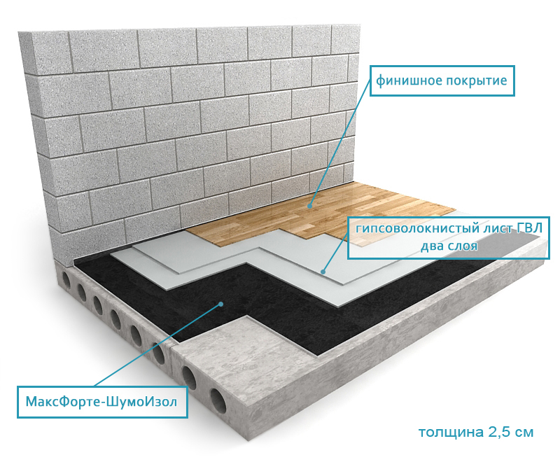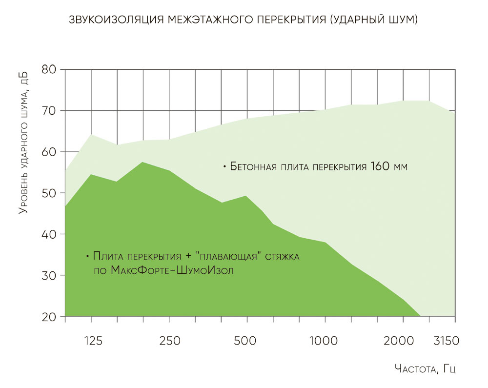 МАКСФОРТЕ ШумоИзол служит для эффективной защиты от вибраций, ударного и структурного шумов (ремонтные работы, шаги соседей сверху, скрип паркета, прыжки детей и т. д.). Индекс снижения ударного шума у ШумоИзола ∆Lnw = 24 дБ, что позволяет успешно использовать материал в промышленных масштабах при строительстве многоэтажных жилых домов и других зданий для выполнения нормативов в части уровня ударного шума.