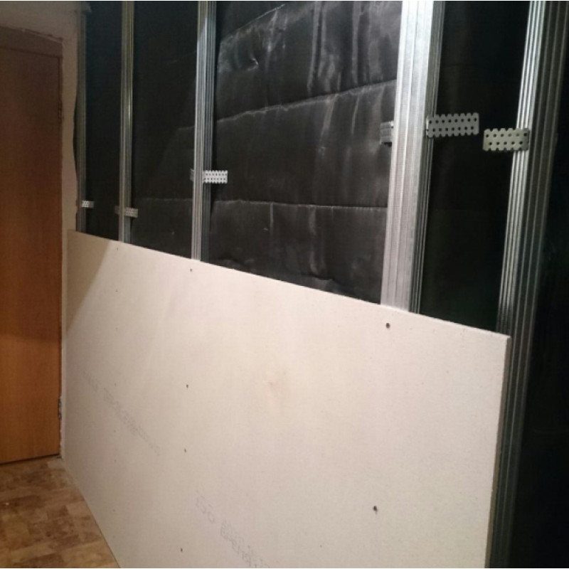 - Тонкая звукоизоляция стен и перегородок. Рулоны МаксФорте-SoundPRO вешаются на стены как ковер и зашиваются гипсокартоном. Толщина конструкции 2-3 см.
