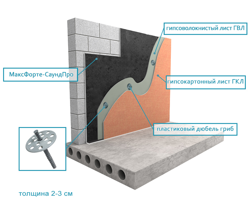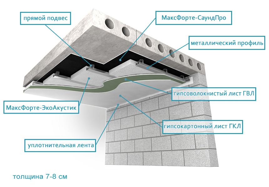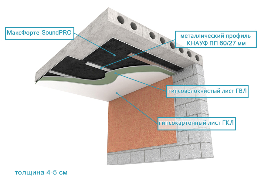 - Тонкая звукоизоляция потолка. МаксФорте-SoundPRO закрепляется к потолку на дюбель грибках и зашиваются гипсокартоном. Толщина 2-3 см.