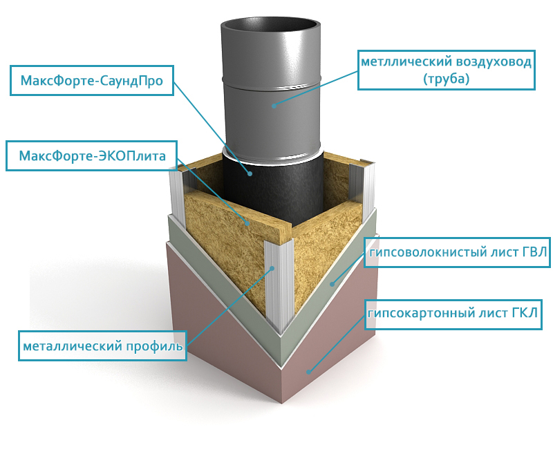 - Звукоизоляция труб. За счет повышенной гибкости и эластичности МаксФорте-СаундПРО удобен для звукоизоляции труб и воздуховодов любого диаметра!