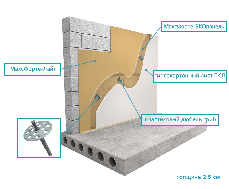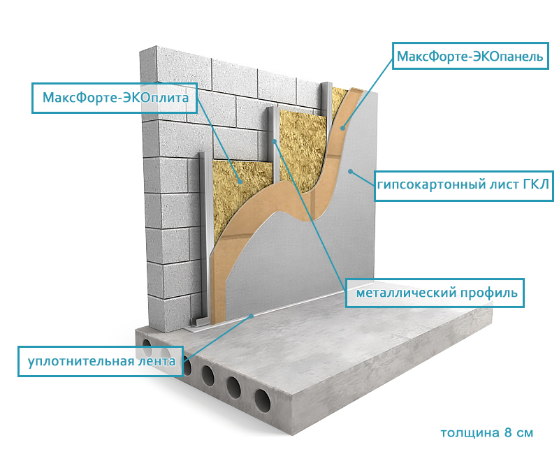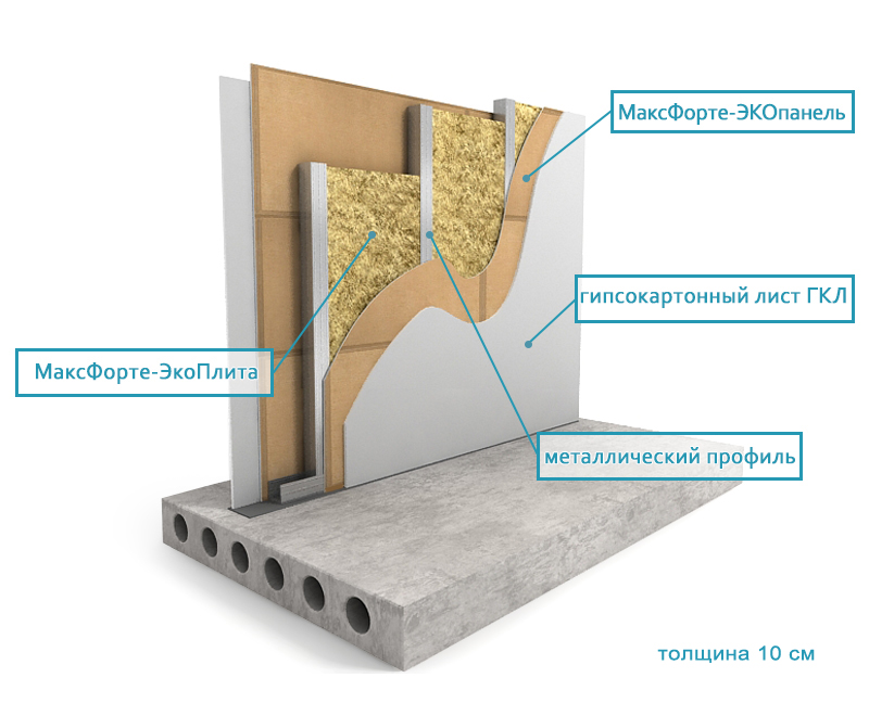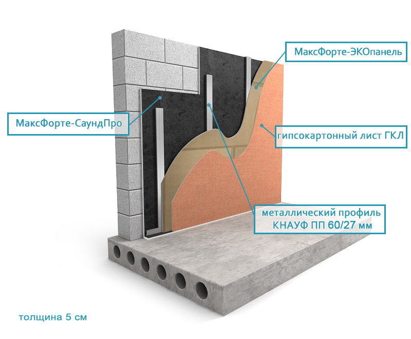 - МаксФорте-ЭКОпанель используется в качестве дополнительного слоя каркасной облицовки при звукоизоляции стен, перегородок и потолков.