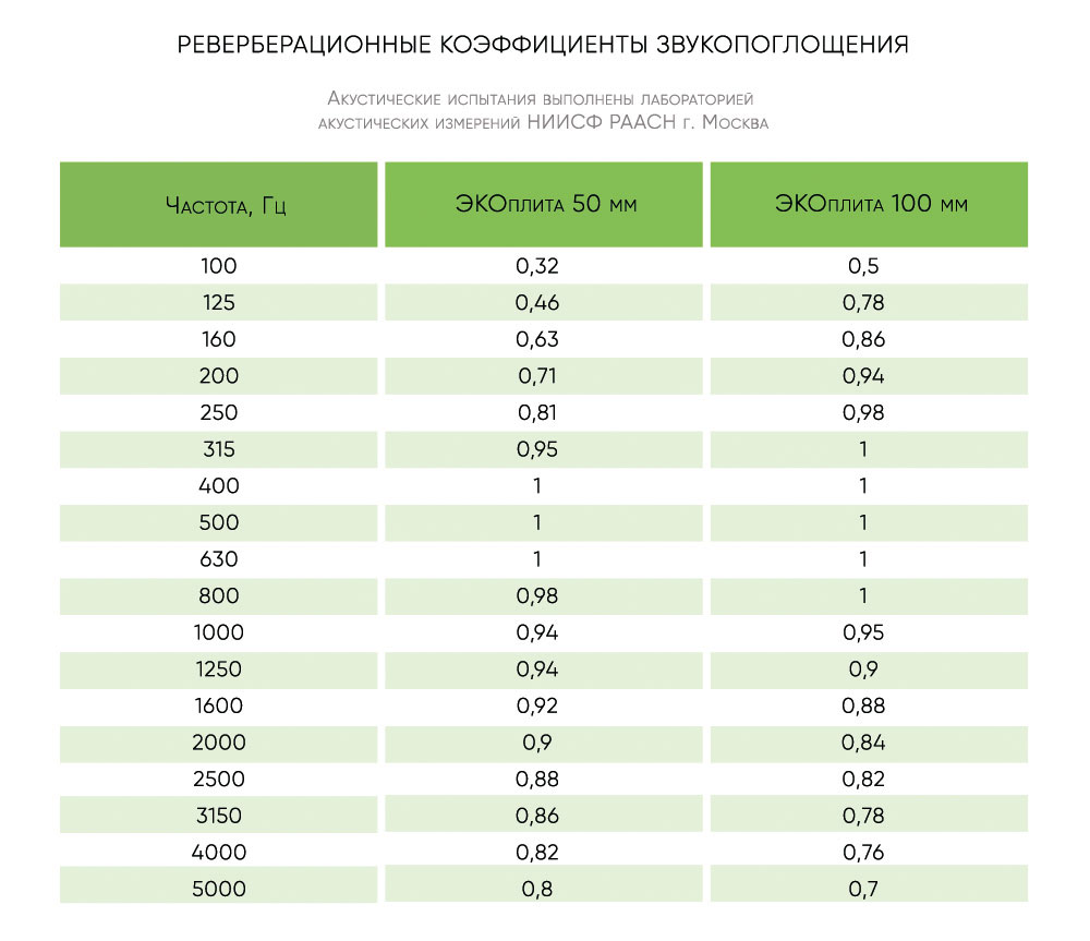 - Материал обладает превосходными акустическим свойствами: высокий коэффициент звукопоглощения αW на всех частотах (включая низкие).