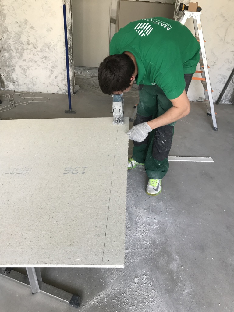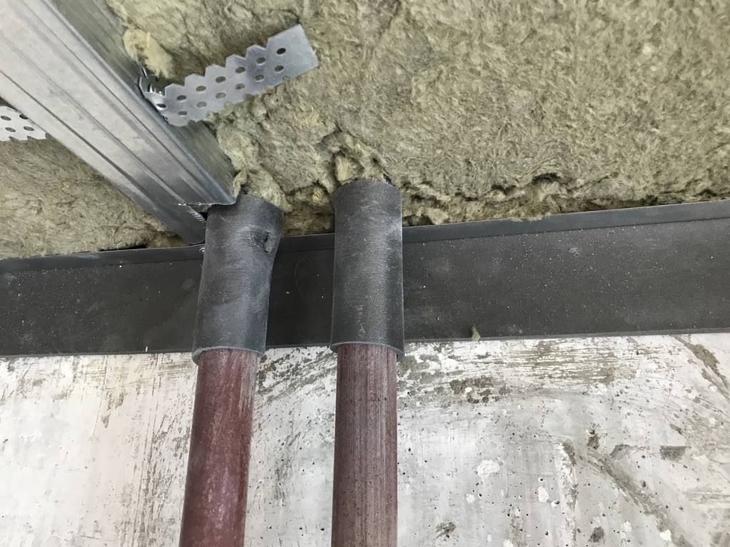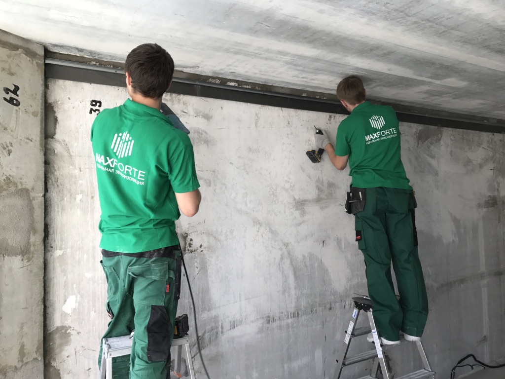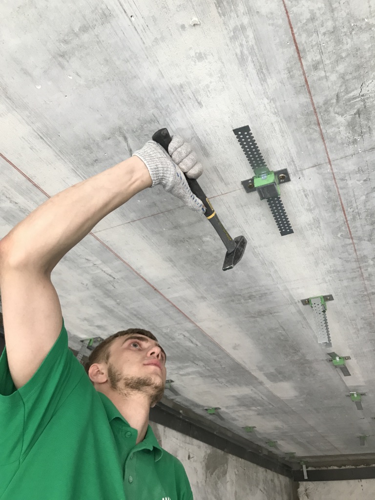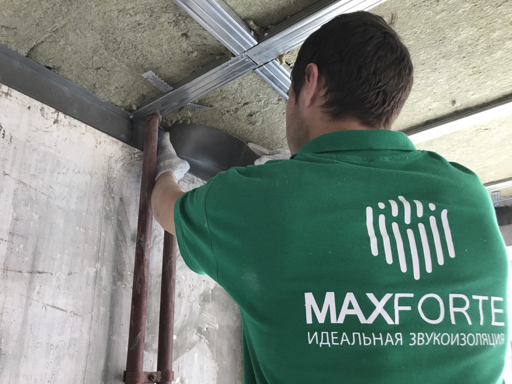 Описывается процесс монтажа звукоизолирующего подвесного потолка: для виброизоляции используются виброподвесы ВиброСтоп PRO 25 мм, для поглощения звука - МаксФорте-ЭКОплита 60 кг/м3.