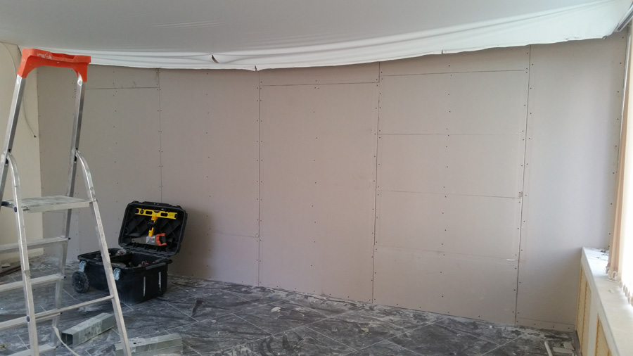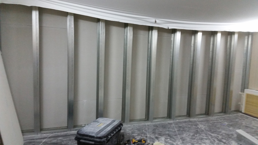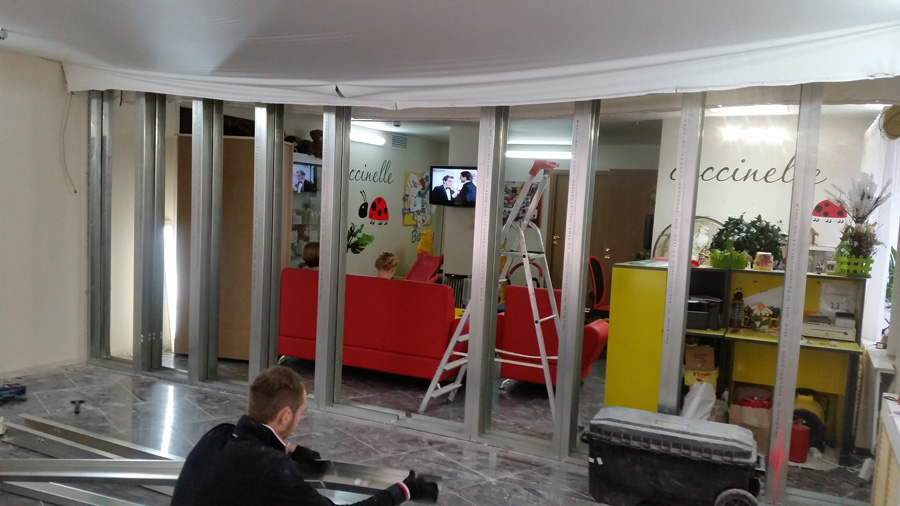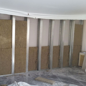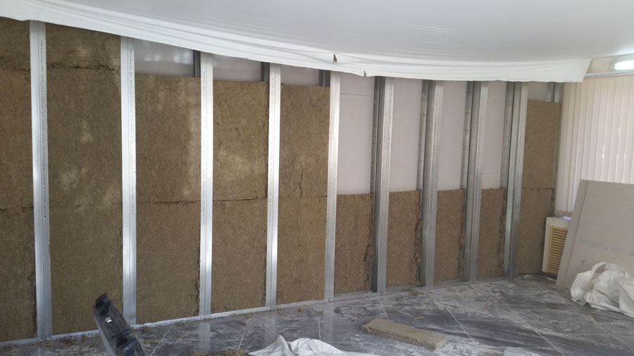 Звукоизоляция перегородки между помещением детского клуба и офисом. Перегородка выполнена на раздельных каркасах KNAUF 100/50 мм. Для звукопоглощения внутри каждого каркаса уложена ЭКОплита в два слоя. Плиты имеют максимальный класс "А" по звукопоглощению и обеспечивают максимальную изоляцию всего спектра, включая низкие частоты.