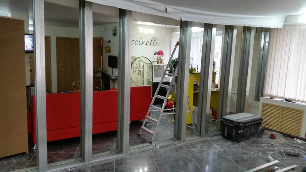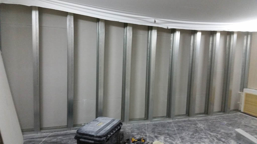 Звукоизолирующая перегородка имеет два независимых друг от друга каркаса, благодаря чему исключается возможность перехода шума с одной половины перегородки на другую, значительно усиливая эффективность звукоизоляции