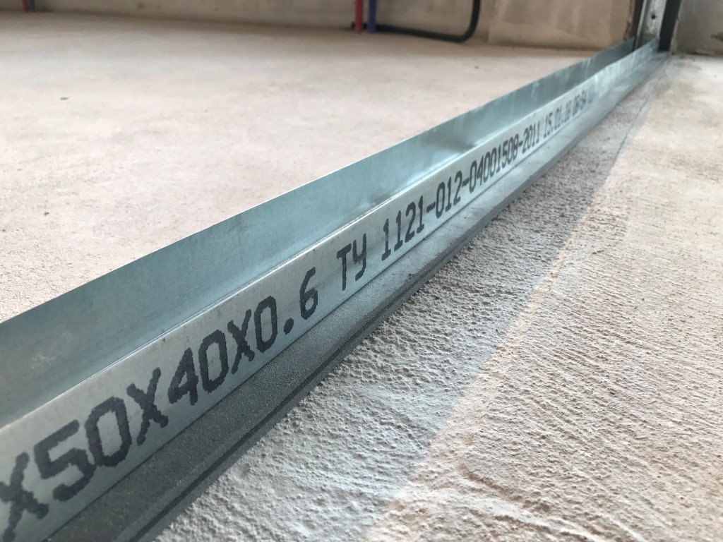 Направляющие элементы каркаса не должны жестко примыкать к полу и потолку. Под направляющие профили необходимо проложить демпфирующую ленту МаксФорте в два слоя. Используем ленту шириной 150 мм. Лента выбирается шире профиля поскольку на нее опираются листы гипсоволокна и гипсокартона.