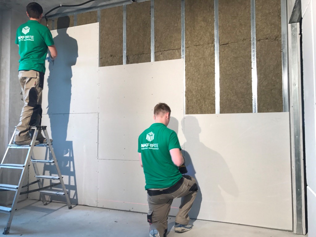 Максимальная звукоизоляция перегородок при минимальной стоимости. Звукоизолирующие перегородки из гипсокартона отличная замена перегородкам из пазогребня/пеноблока. Выполненная по технологии КНАУФ перегородка будет обладать высокой жесткостью и способностью выдерживать большие нагрузки. Звукоизоляция стандартной перегородки толщиной 10 см с использованием МаксФорте-ЭКОплиты 60 кг/м³ составляет 55 дБ и достаточна для комфортного проживания в квартире. Благодаря простой конструкции и быстрому монтажу звукоизолирующие перегородки из гипсокартона зарекомендовали себя как надежное решение при шумоизоляции квартир, офисов, студий звукозаписи и других объектов.