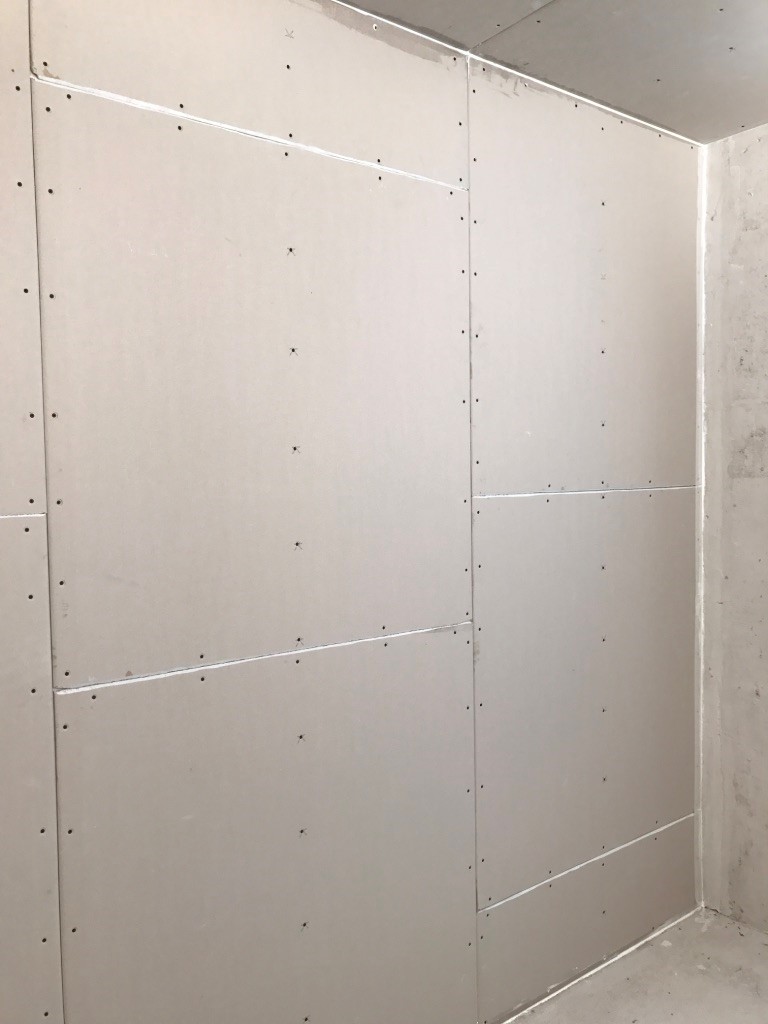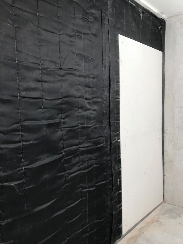 Периметр смежных поверхностей (пол, потолок, соседние стены) проклеивается Демпферной лентой в два слоя. Осуществить монтаж Гипсоволокнистого лист (ГВЛ) толщиной 10 мм. Лист прижимается к МаксФорте-SoundPRO и закрепляется к стене через МаксФорте-SoundPRO. Крепление осуществляется пластиковыми дюбелями-(~5 штук на м2). Смонтированные листы ГВЛ должны примыкать к смежным поверхностям через демпферную ленту Швы между листами ГВЛ пройти силиконовым герметиком МаксФорте.